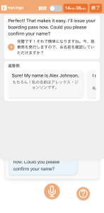 AI講師の音声聞きなおしボタン、日本語訳、それに対する回答例が表示されます。
